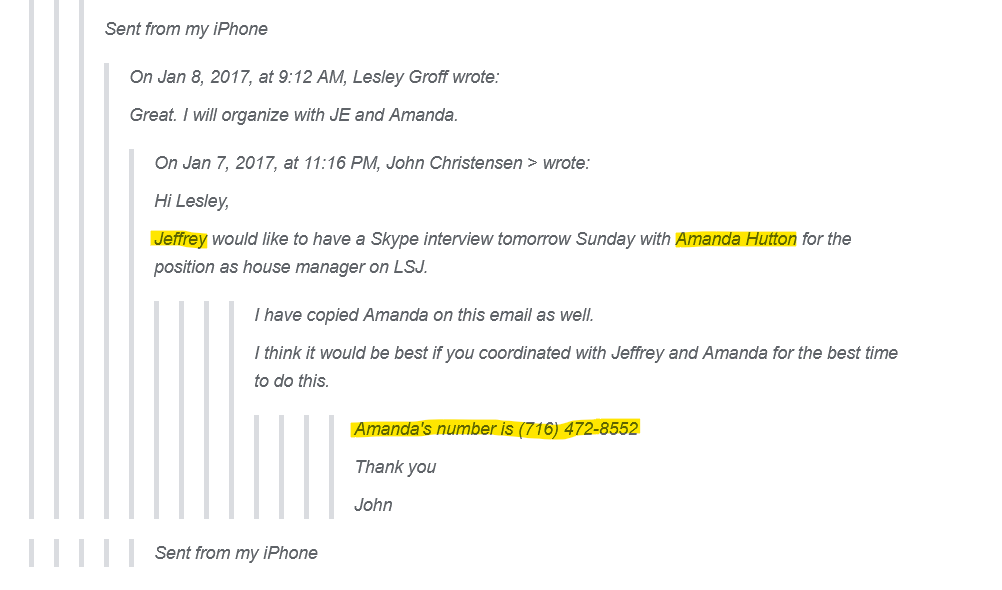 E-mail communications show that days later after referencing Buffalo, NY Jeremy Jacobs employee, Epstein & Co. would reach out to a Buffalo, NY woman named Amanda Hutton for the position as house manager on Epstein’s Island.