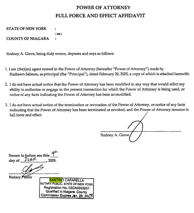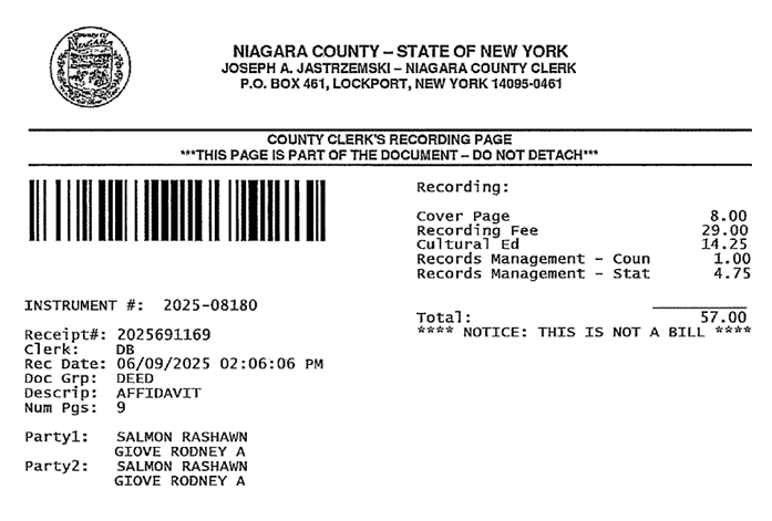 Pictured: Niagara County Clerk Records showing an affidavit between Town Justice Rodney Giove and Rashawn Salmon