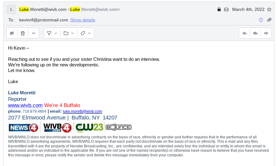 7.) WIVB News 4 Luke Moretti – WIVB Luke Moretti and Dan Telvock were the only news station who would talk to Kevin and Christina Riford about their missing sister Katie Riford and Children which they found odd as they contacted every other news station in the Buffalo, NY area. Ironically, they omitted the FBI Audio which they had provided to Dan Telvock and Luke Moretti. You can read and listen more about that here: https://rifordmedia.com/wivb-ch-4-interview-with-christina-and-kevin-riford-fbi-special-agent-brian-burns/