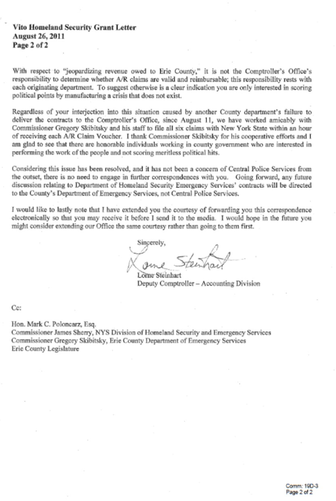 Pictured: August 26, 2011, Erie County Deputy Controller letter referencing Peter Vito Homeland Security Grant