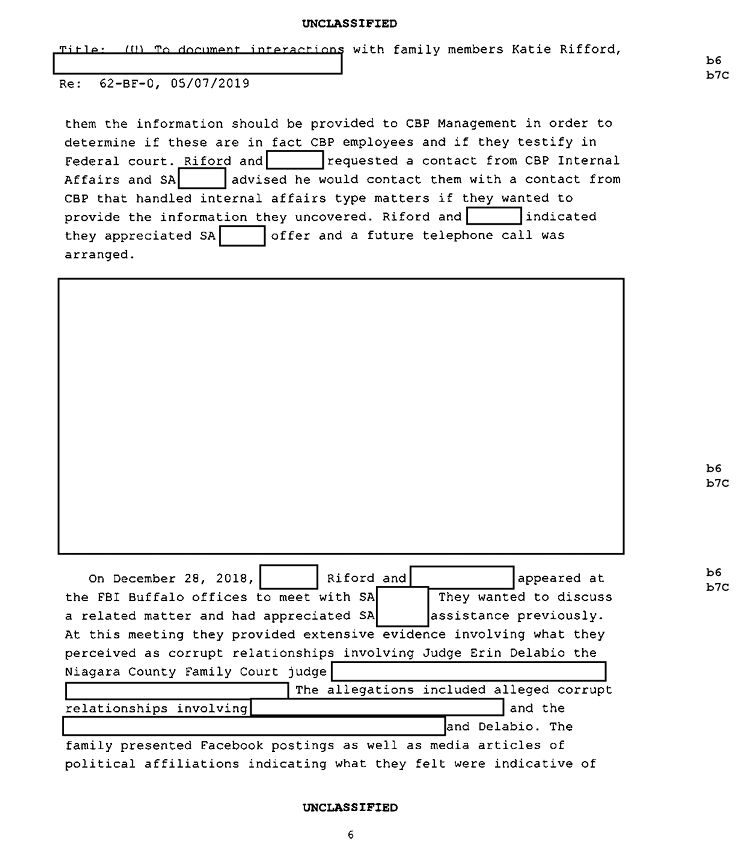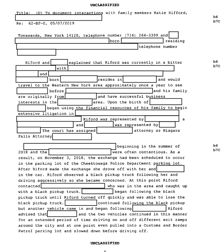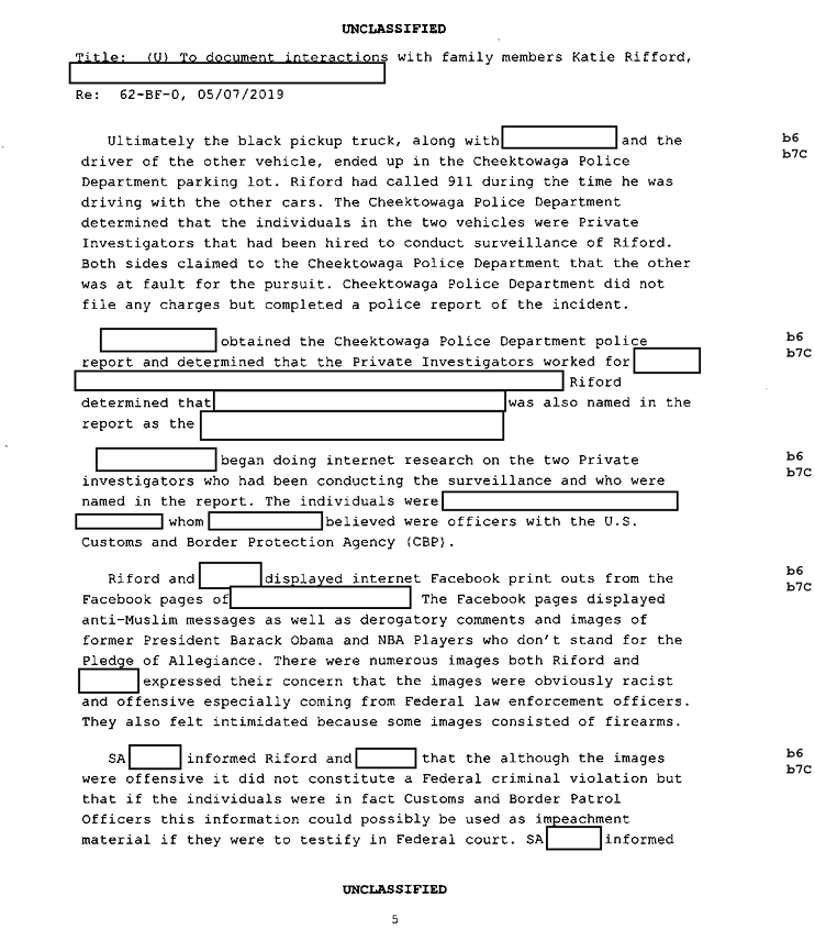 Pictured: FBI FOIL documents regarding the Riford family reporting Patrick Ostrowski and Michael Mazga who were moonlighting as “private investigators” while working for the Department of Homeland Security (CPB)