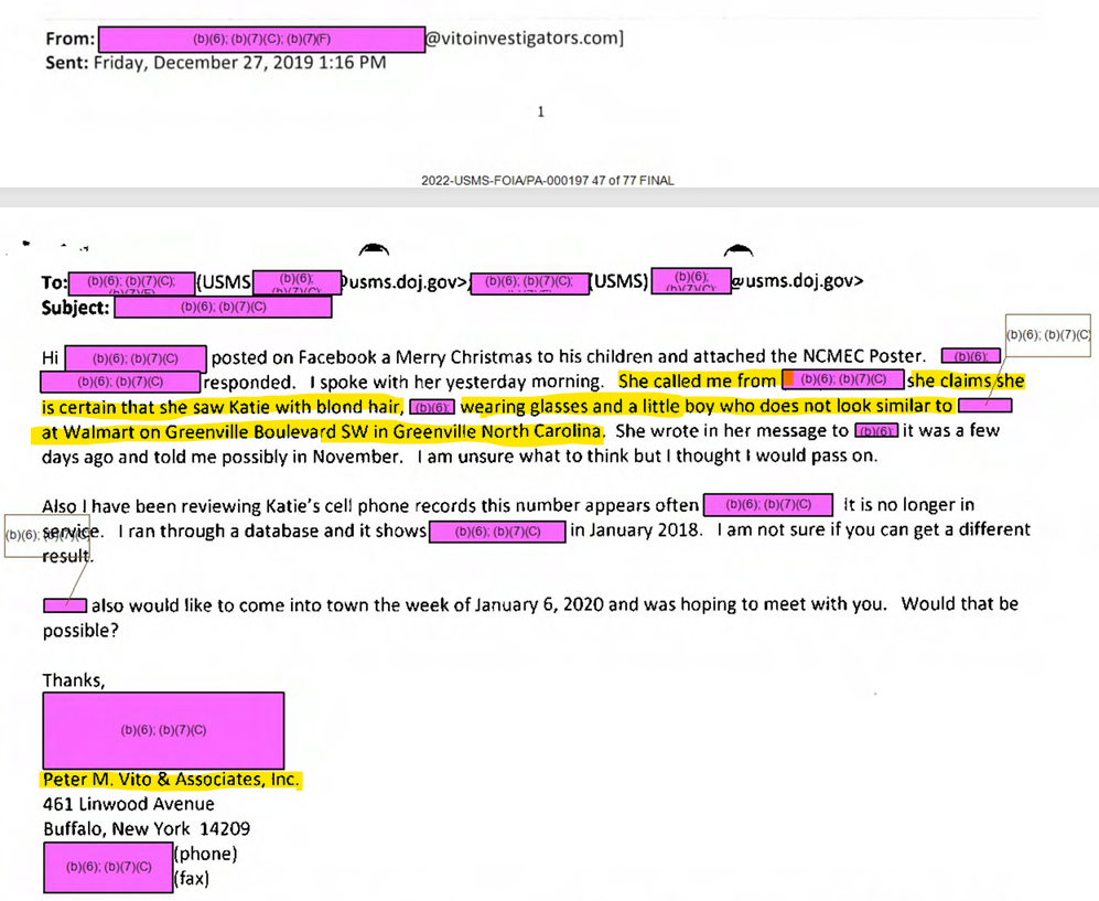 Isn’t it interesting, that Peter M. Vito stated my missing sister Katie Riford was spotted in North Carolina, the same place, Ms. Ghazi has connections to as well. The below is United States Marshall records obtained via FOIA request.